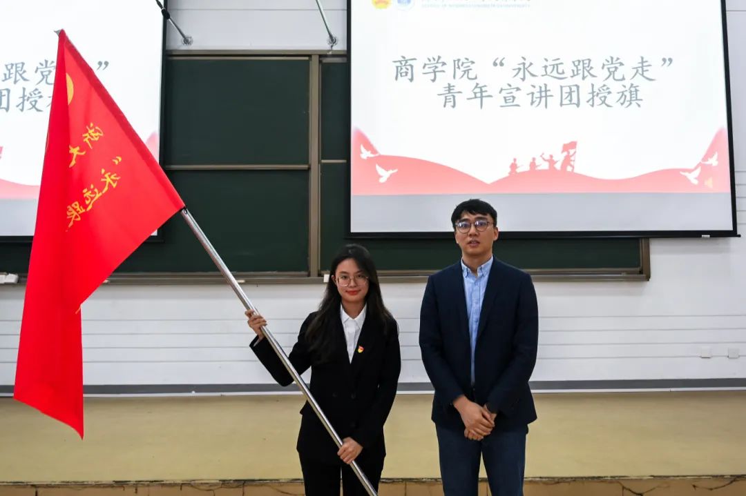 接着,yl23411永利官网登录思政主管潘剑邦老师为“永远跟党走”青年宣讲团授旗,党员教育发展中心副主席郑芷萱同学作为代表上台。