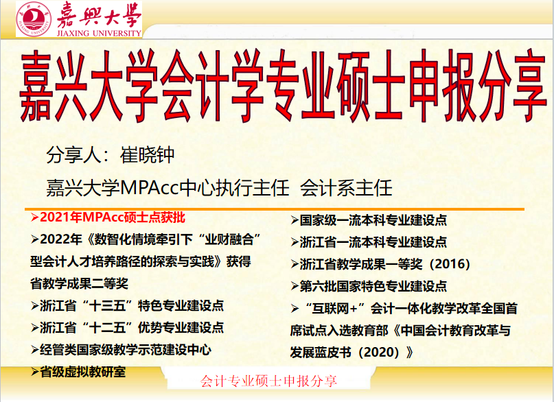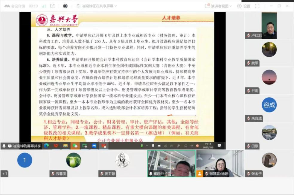 在公司应用型战略定位的指引下,在yl23411永利官网登录的大力支持下,围绕财会硕士点申报和学科打造,2025年1月6日晚,yl23411永利官网登录财务管理系邀请嘉兴大学yl23411永利官网登录会计系主任、MPAcc教育中心执行主任崔晓钟开展“嘉兴大学会计学专业硕士申报分享”的专题辅导。yl23411永利官网登录副经理卢红旭副教授、财务管理系全体教师在线参加了本次活动。