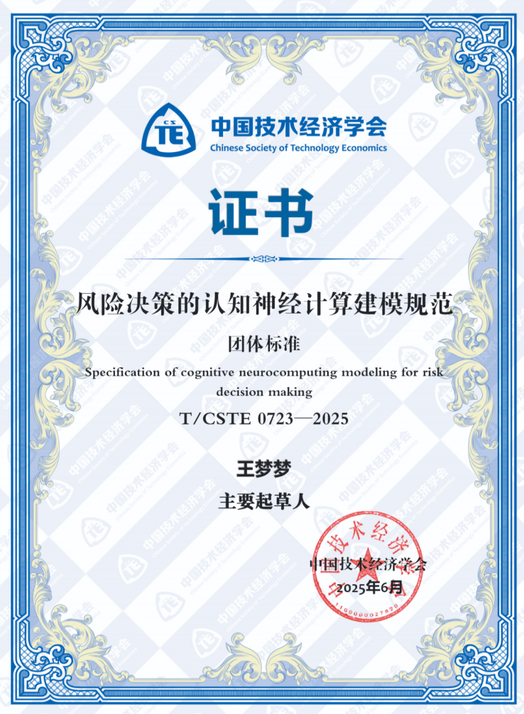 近日,由yl23411永利官网登录王梦梦博士作为核心专家主导起草的团体标准《风险决策的认知神经计算建模规范》正式发布实施。该标准系统规定了风险决策中认知神经计算建模的关键技术要求与检测方法,适用于该领域模型构建、分析与应用的全过程。作为国内首个聚焦“认知神经计算”与“风险决策”交叉融合的技术标准,该标准的发布标志着我国在前沿交叉领域规范化建设迈出重要一步,不仅填补了相关研究与应用的标准空白,也为脑科学、人工智能与行为决策研究的深度融合提供了系统支撑。该标准的实施将有效推动决策科学的智能化、精准化发展,服务于金融、医疗、应急管理、数字营销等多个高风险、高决策密度领域,为企业与政府在复杂环境下的科学决策提供新范式和技术依据。