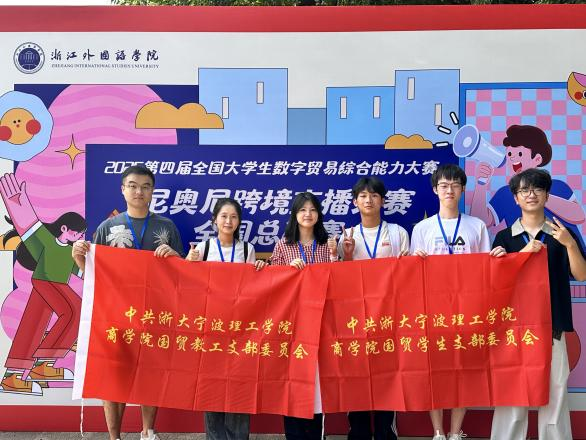 队长陈凯丽,队员孙舒逸、郑毂、王凡、丁字杰在何巨、张家滋老师的指导下,荣获尼奥尼跨境直播赛全国三等奖。