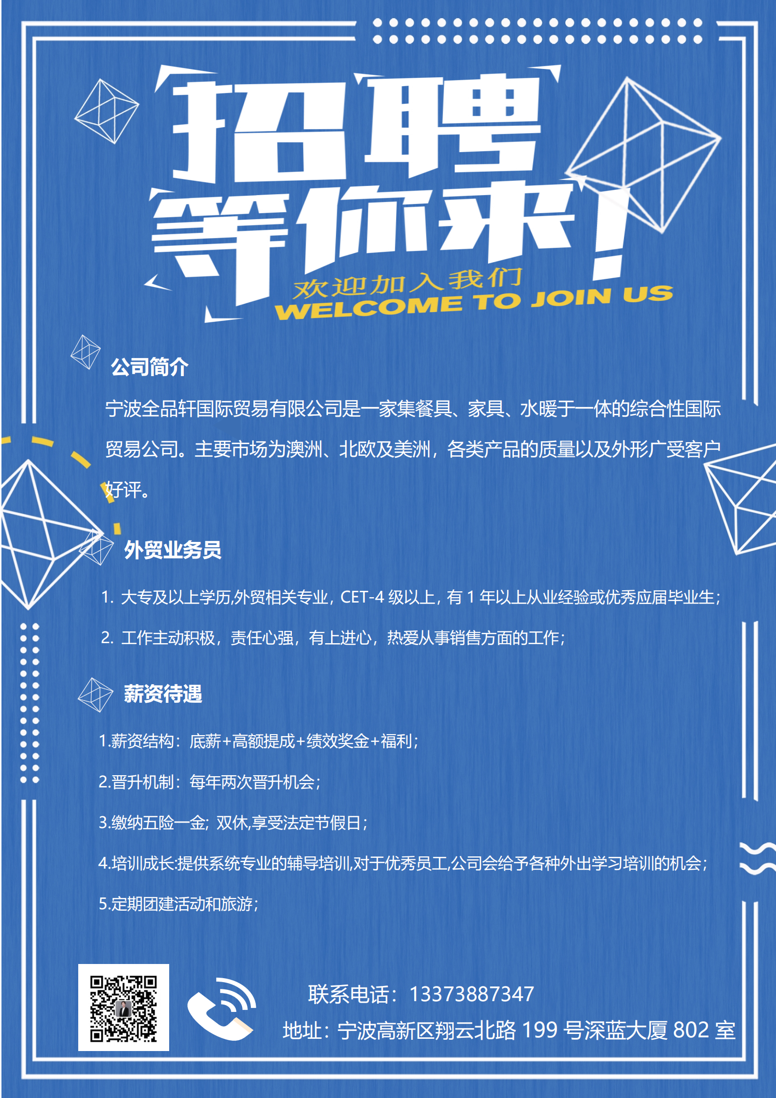 【招聘】宁波全品轩国际贸易有限公司招聘简章