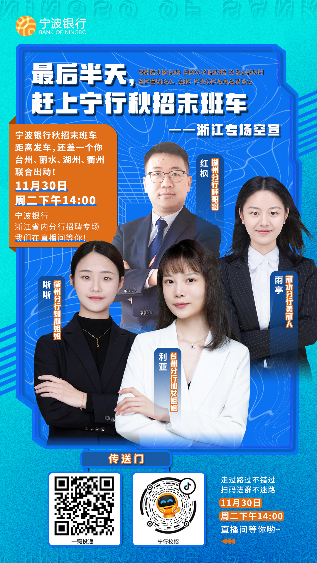 【宁波银行空中宣讲会来啦!】秋招至今还没找到心仪岗位?来自台州、丽水、湖州、衢州的HR,向你递出秋招末班车车票!