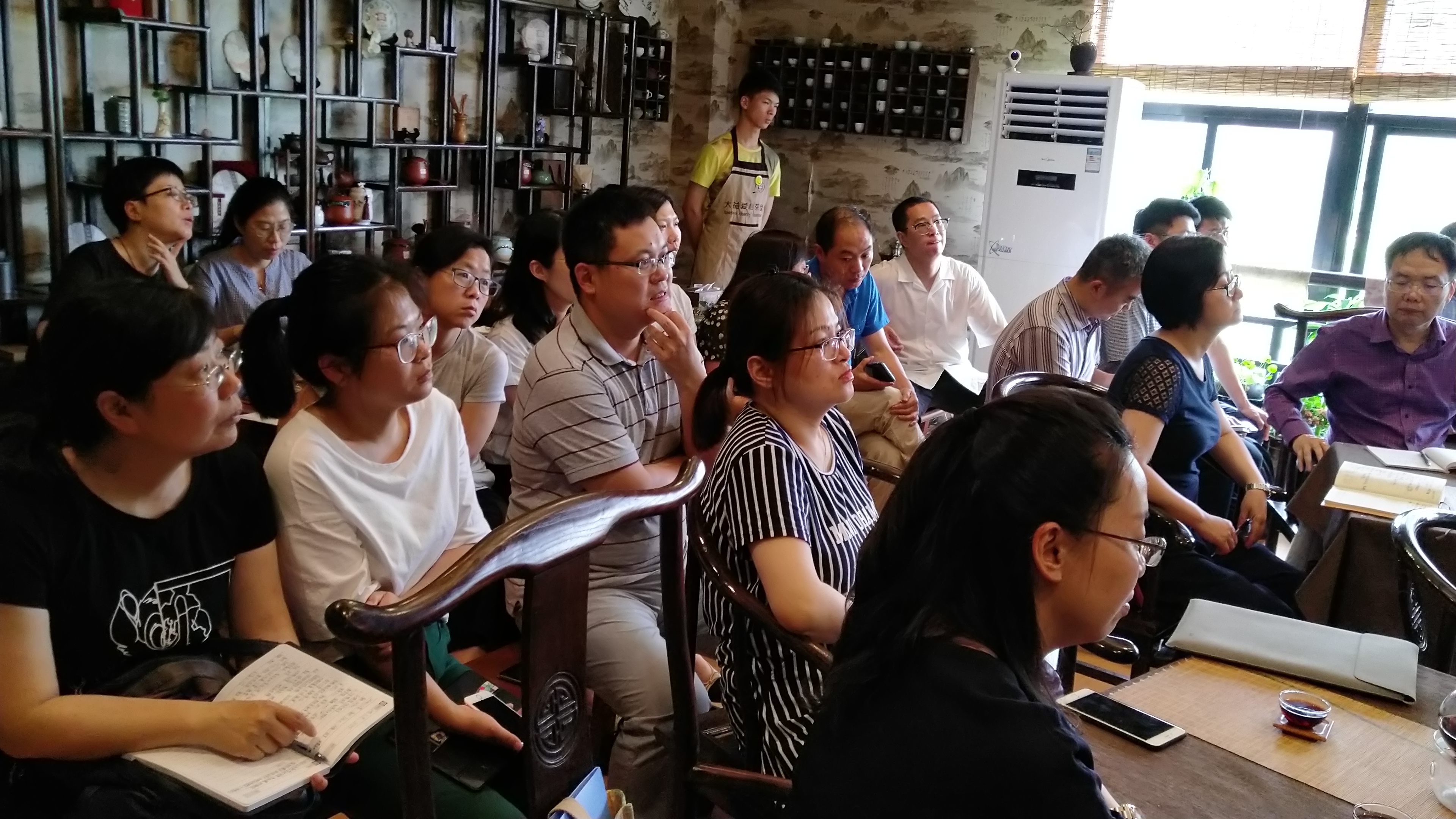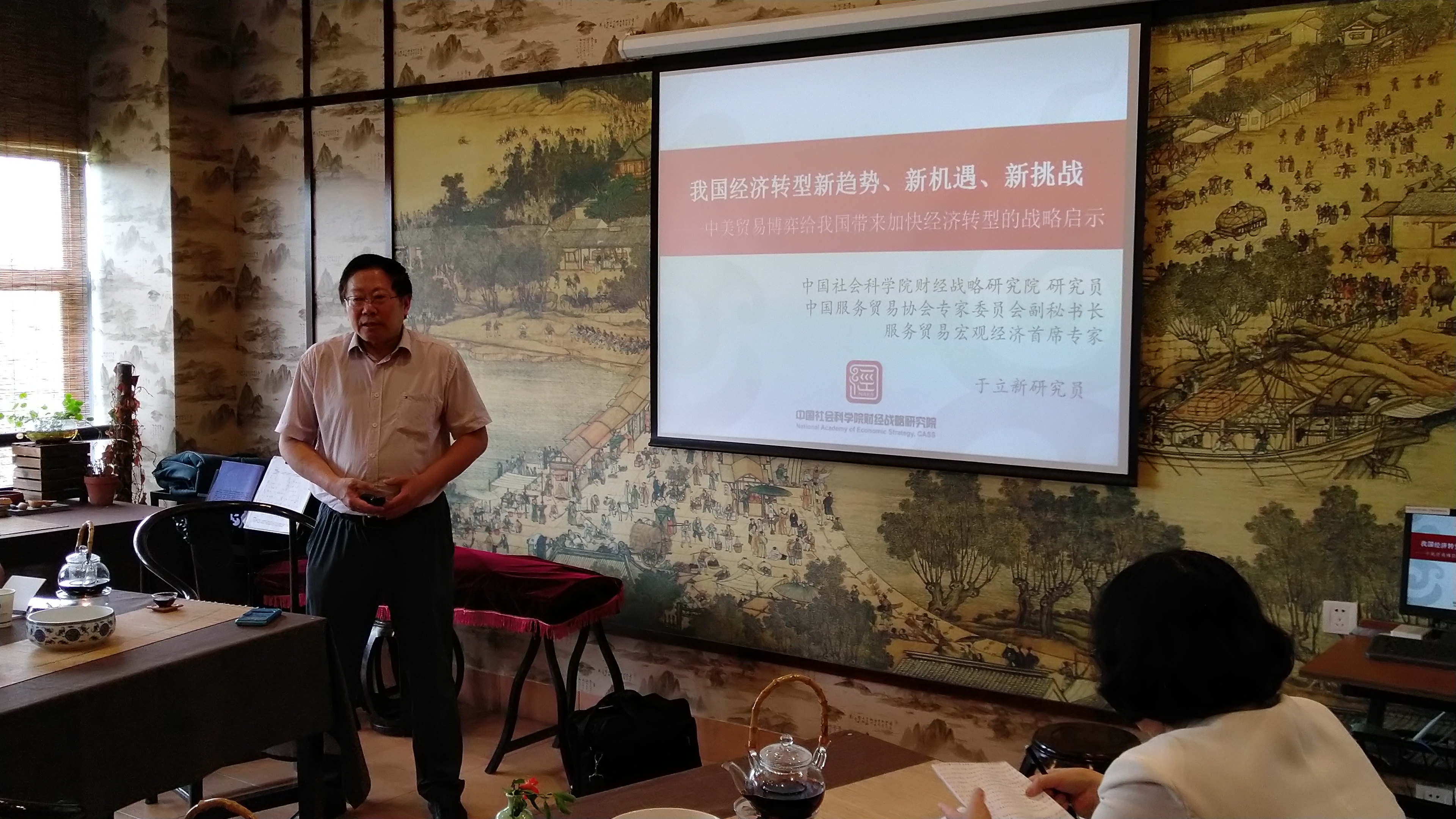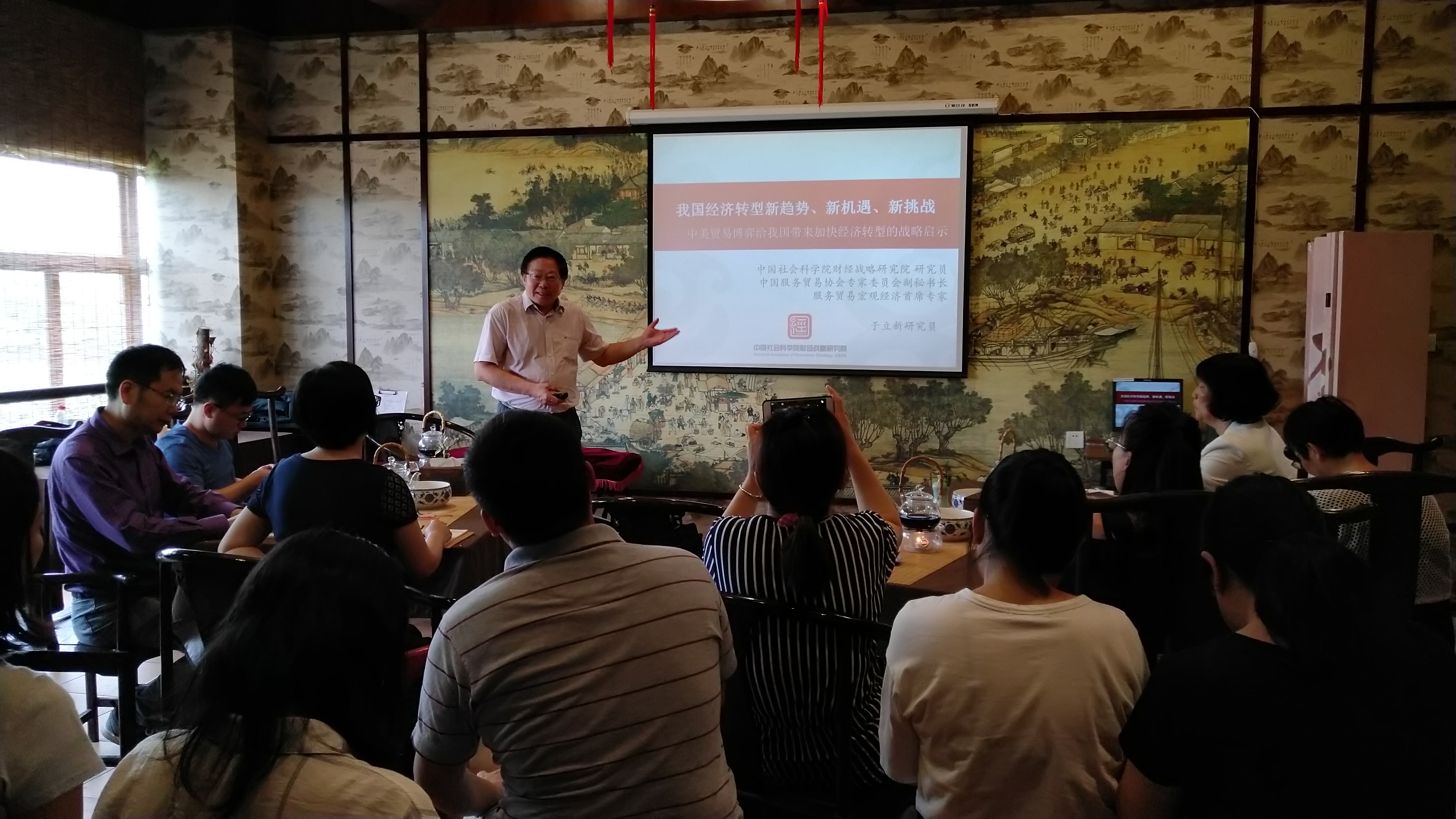 2018年6月13日中午,公司在大益爱心茶室举办了第二十二期学术沙龙,此次沙龙公司邀请了中国服务贸易协会专家委员会副秘书长、中国社会科公司财经战略研究院研究员、中国世界贸易组织研究会理事于立新,为我们带来了《我国经济转型新趋势、新机遇、新挑战—中美贸易博弈给我国带来加快经济转型的战略启示》的主题分享。