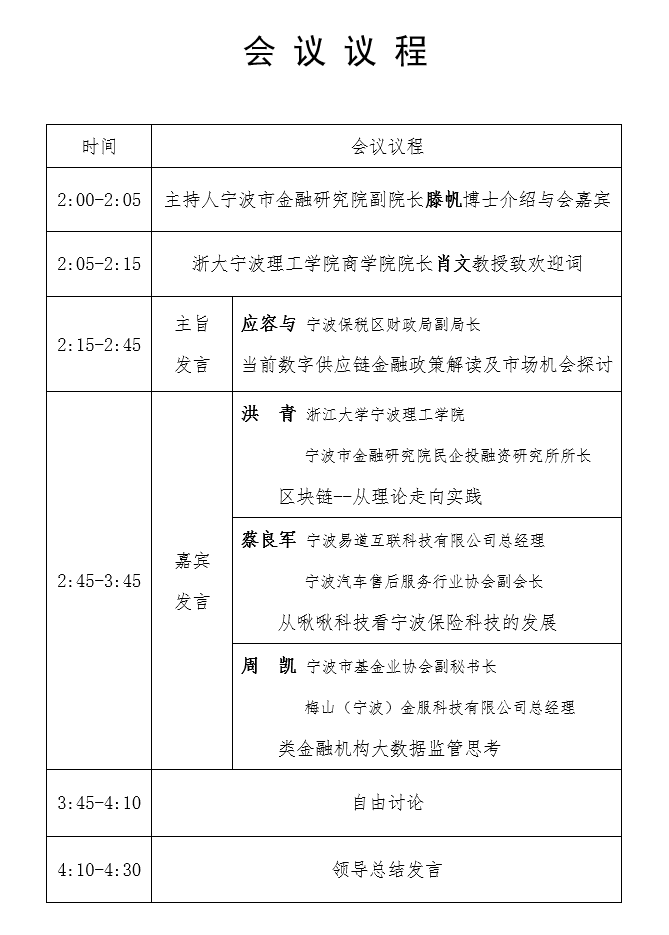 会议将设置三个基本环节:一是邀请有关专家对金融科技发展的国际经验与宁波特征进行主旨发言;二是邀请企业和学界嘉宾着重探讨宁波发展金融科技的优势、不足与政策优化;三是邀请政府有关部门负责人进行政策说明和解读,为金融机构、保险机构、科技企业等提供政策引导。