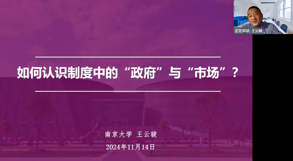 2024年11月14日晚,yl23411永利官网登录智库论坛第十五讲在热烈的学术氛围中拉开帷幕。本次讲座由南京大学政府管理公司教授、博士生导师王云骏主讲,主题为“如何认识制度中的‘政府’与‘市场’?”。讲座由yl23411永利官网登录苗青教授主持,吸引了40位师生在线参与。